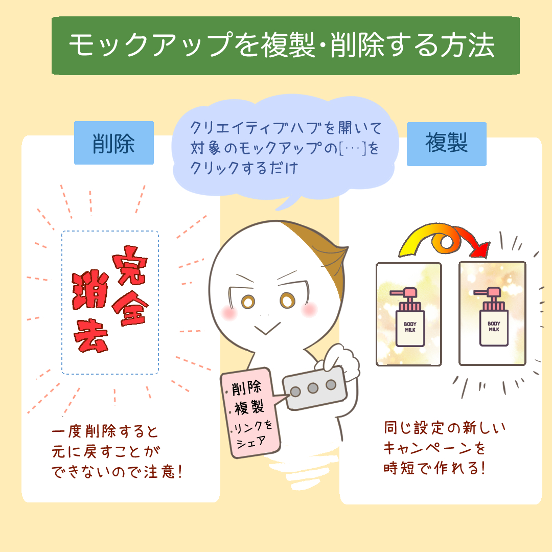クリエイティブハブのモックアップを複製することで、同じような設定の新しい広告キャンペーンを素早く作成できるというメリットがあります。