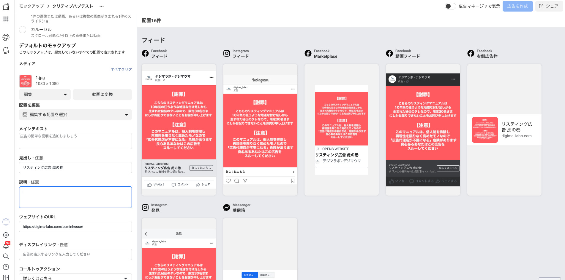 モックアップをプレビューで広告がFacebookやInstagram上でユーザーにどのように表示されるのかを確認しクリエイティブが最もよく見えるように調節してください。