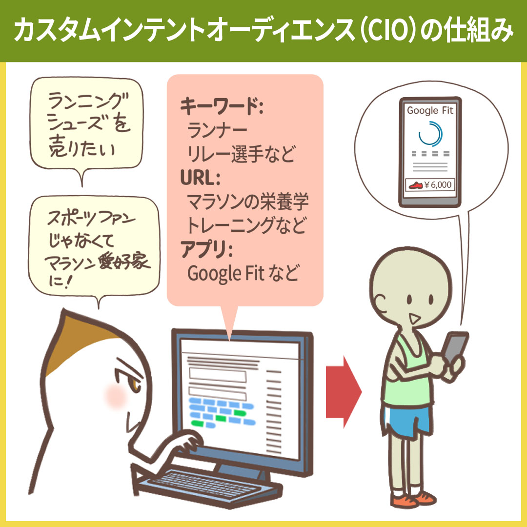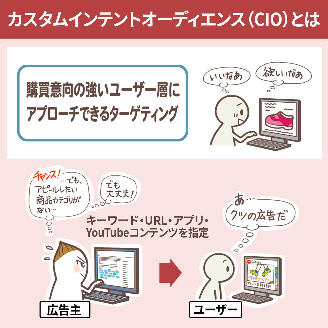 あらかじめ用意された「購買意向の強いオーディエンス」にアピールしたい商品やサービスに関連するカテゴリがない場合に、キーワードやURL、アプリ、YouTube コンテンツを指定して独自の購買意向の強いユーザー層を定義し、ターゲティングする機能が「カスタム インテント オーディエンス(CIO)」です。