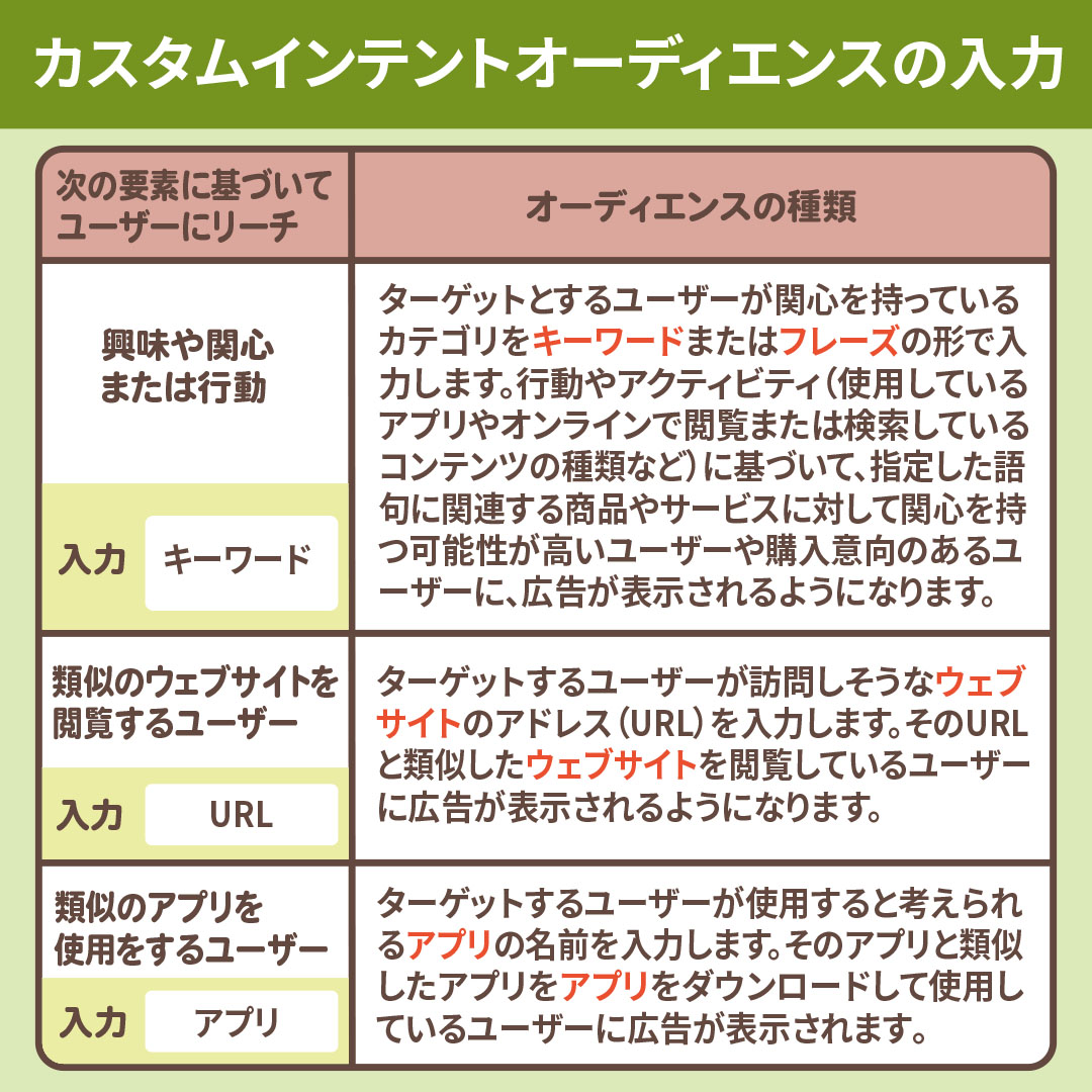 - カスタムインテント 特定のトピックについて調べていたり、購入を検討している、すなわち購買意向の高いユーザーの集まりを指します