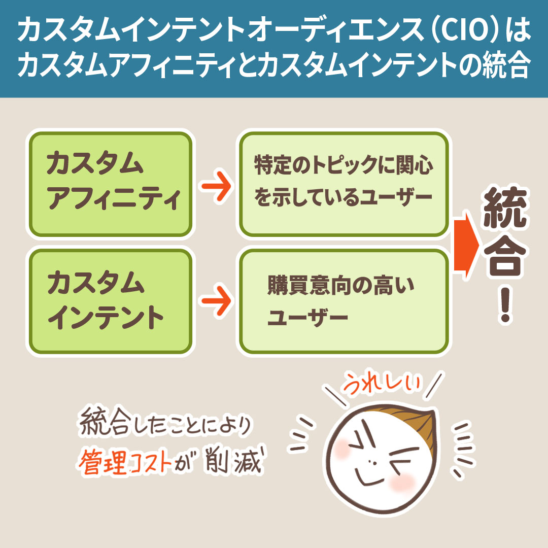 カスタムアフィニティとカスタムインテント、以前では別々での管理のため、それぞれにコストがかかっていました。今までカスタムアフィニティとカスタムインテント、それぞれで複数配信していた場合は、今後は一箇所での管理になるため、管理コストが削減できます。