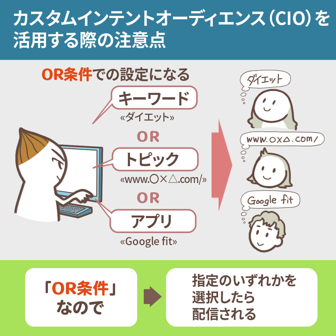 Googleでは「購買意向の強いユーザー層」と定義されているので、初心者の方は、ユーザーの興味関心として捉えておいて問題なさそうです。 ただし、「トピックターゲット」は特定のトピックに関連する「配信面」の設定であることに対して、カスタムインテントオーディエンス(CIO)は「誰に出すか」のターゲティングなので、混合しやすいので注意してください。
