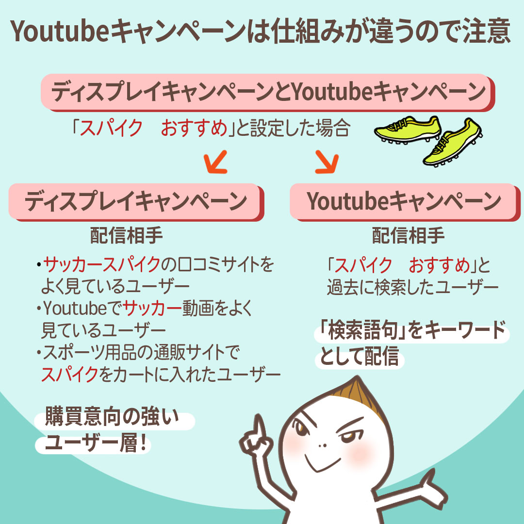 それに対し、YouTubeキャンペーンのカスタム インテント オーディエンスでは、商品やサービスを検索する時に使用した「検索語句」をキーワードとして指定して広告を配信します。