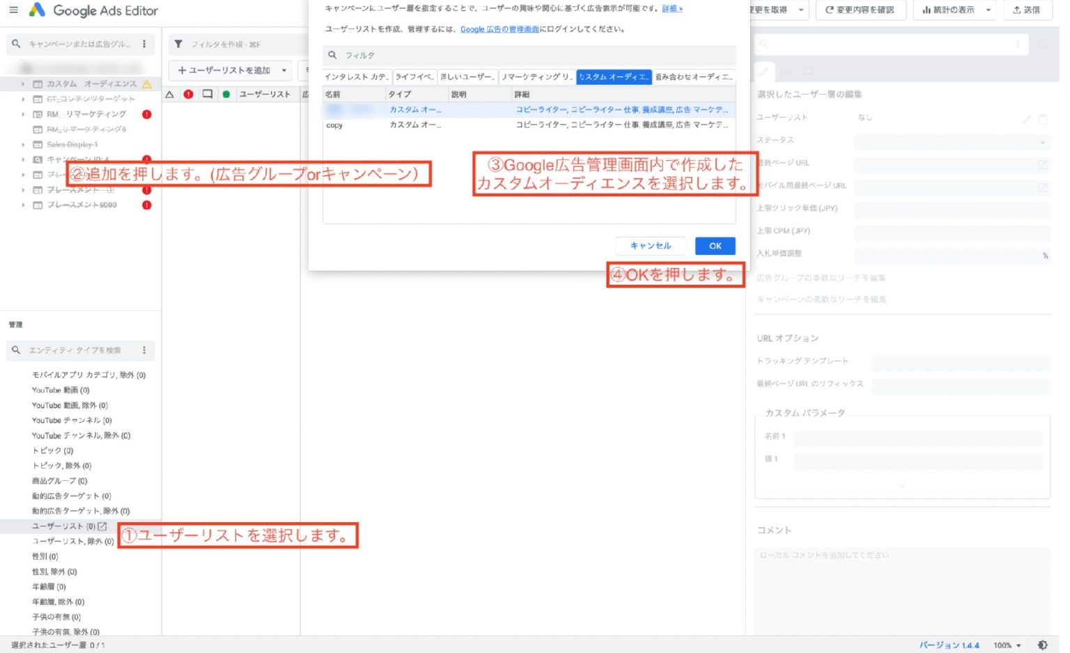 Google広告エディターでも反映が可能(前提として管理画面でカスタムオーディエンスを作成する必要がある)