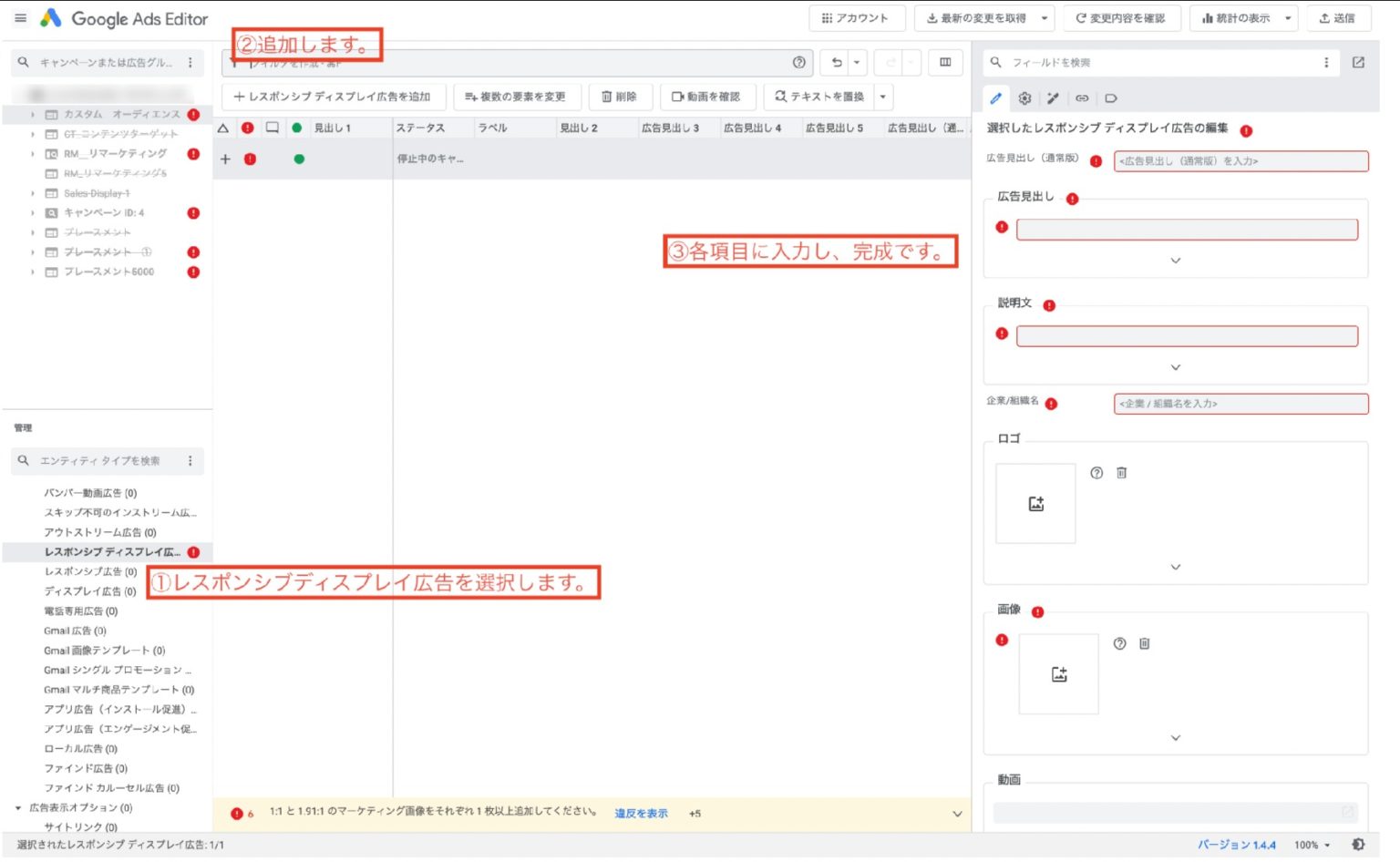 ①レスポンシブディスプレイ広告を選択 ②追加 ③各項目に入力して完了です。