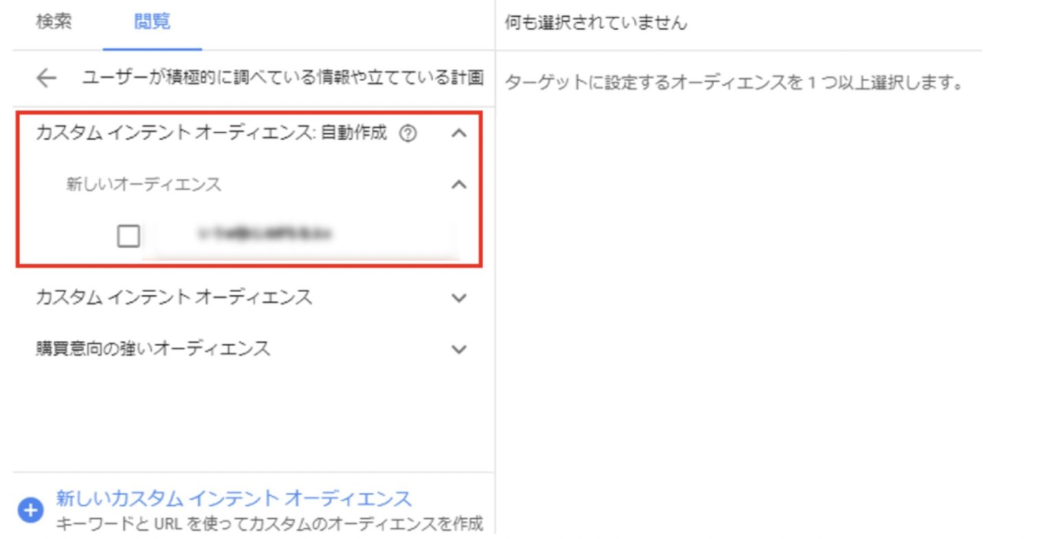 購買意向の強いオーディエンスにアピールしたい商品やサービスに関連するカテゴリがない場合、「カスタム インテント オーディエンス」で購買意向の強いユーザー層を独自定義しましょう。