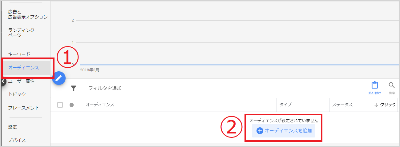 ① 設定対象の広告グループを選択して「オーディエンス」をクリック ②「+オーディエンスを追加」をクリックしてオーディエンスの設定画面を開く