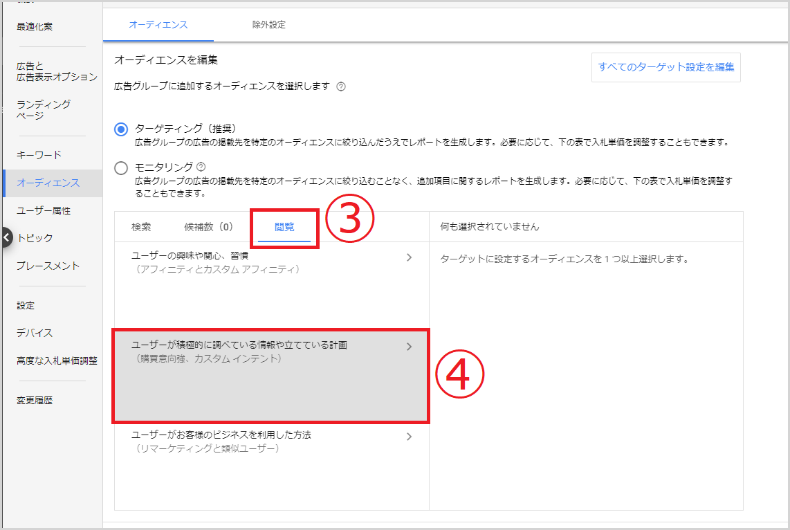 ③「閲覧」タブをクリック ④「ユーザーが積極的に調べている情報や立てている計画」をクリック