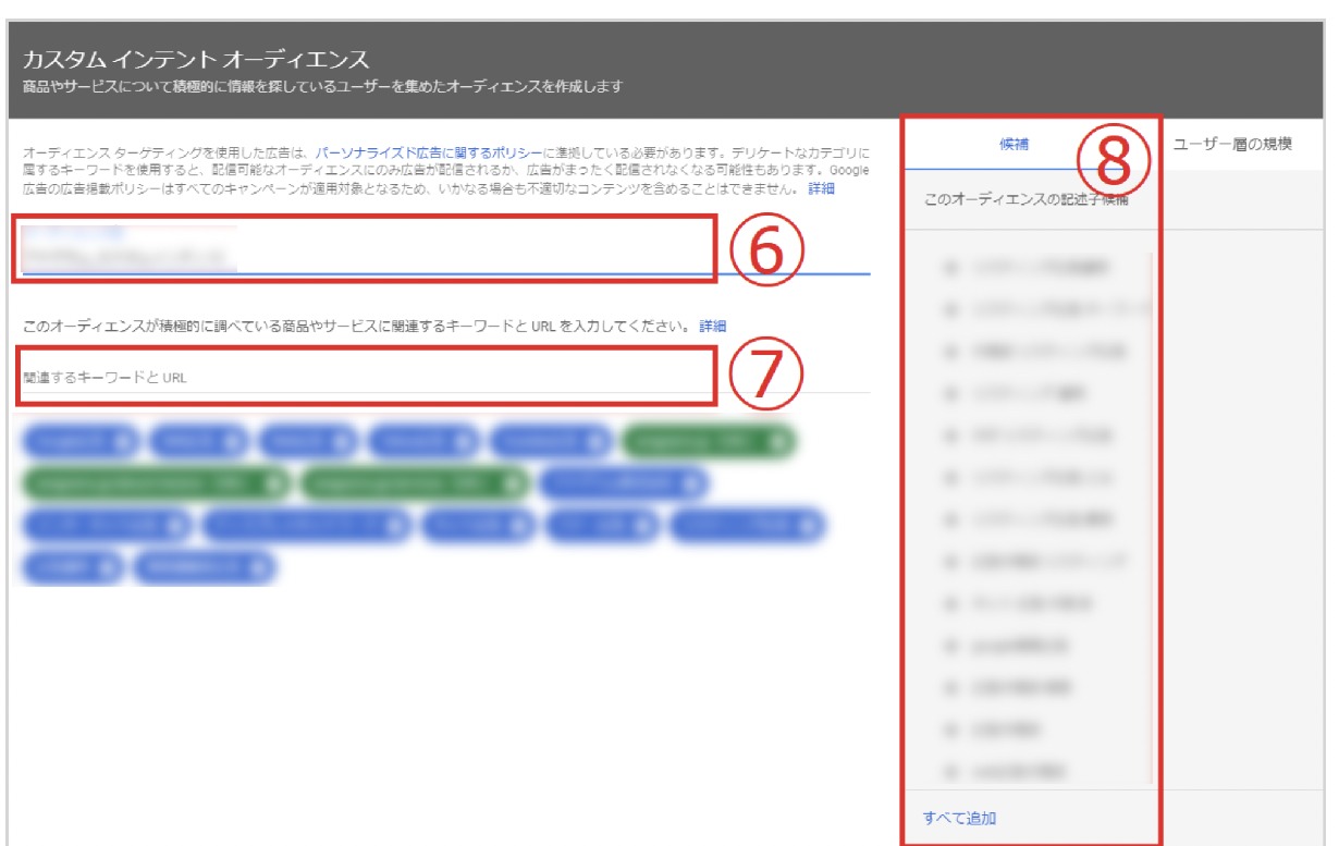 ⑥「オーディエンス名」を入力 ⑦ アピールしたい商品やサービスに関連するキーワードやURL、アプリ、YouTubeのコンテンツを入力