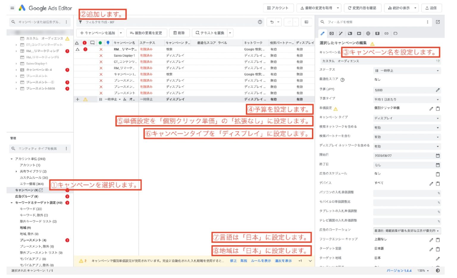 ①キャンペーンを選択 ②追加 ③キャンペーン名 ④予算 ⑤単価設定 ⑥キャンペーンタイプ ⑦言語 ⑧地域、などを設定していきます。