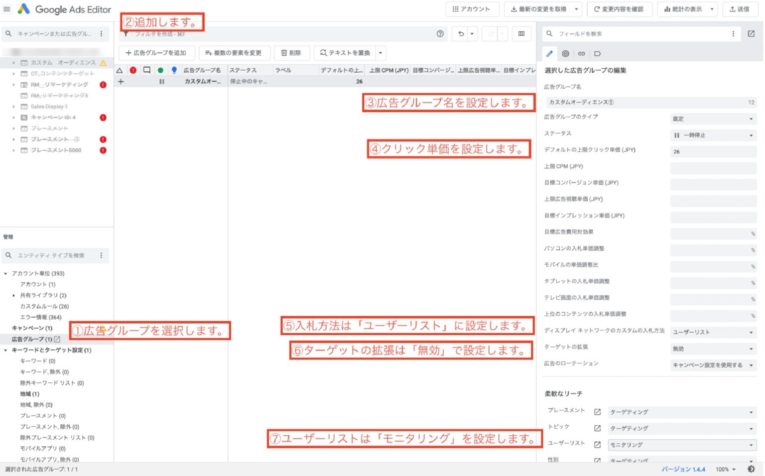 ①広告グループを選択 ②追加 ③広告グループ名 ④クリック単価 ⑤入札方法を「ユーザーリスト」に ⑥ターゲットの拡張 ⑦ユーザーリスト、などを設定していきます。