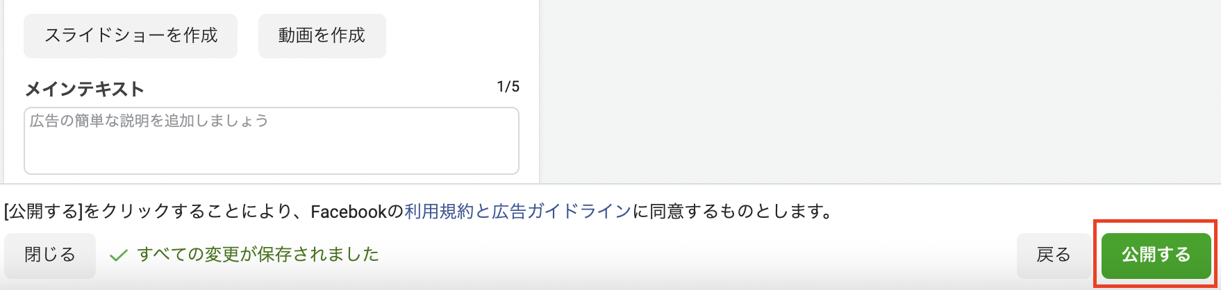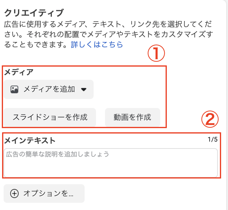 クリエイティブ:メディアをアップロードし、メインテキストを入力してください。