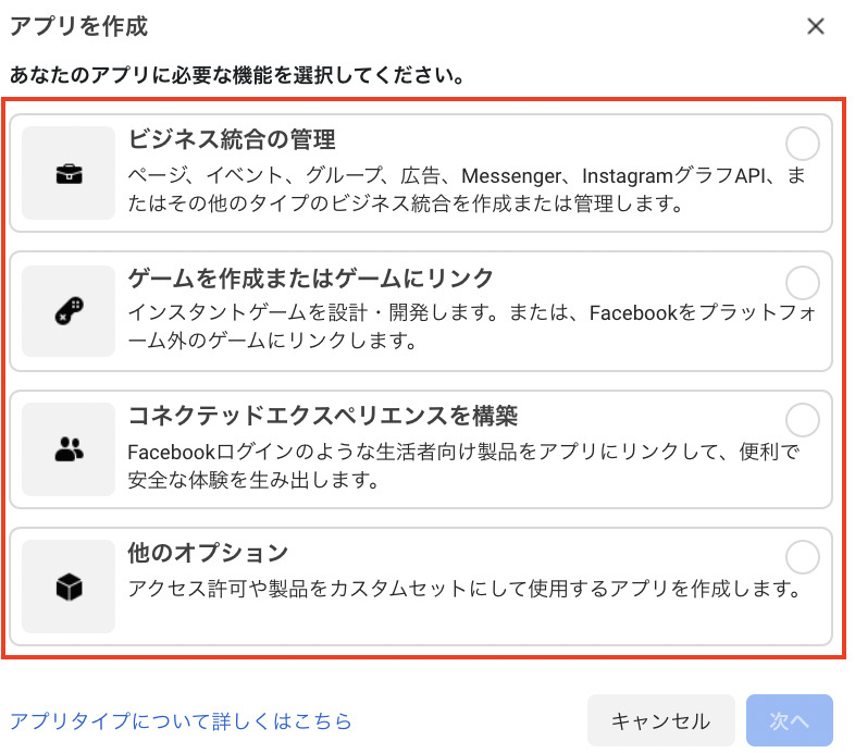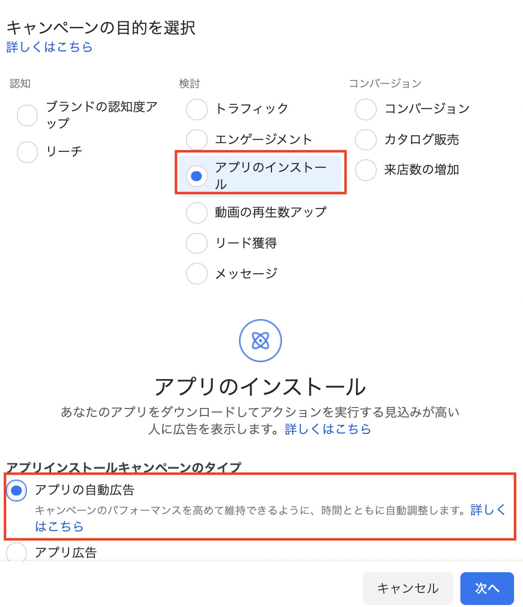 アプリのインストール」をクリックし、キャンペーンタイプを選択し「次へ」進みます。