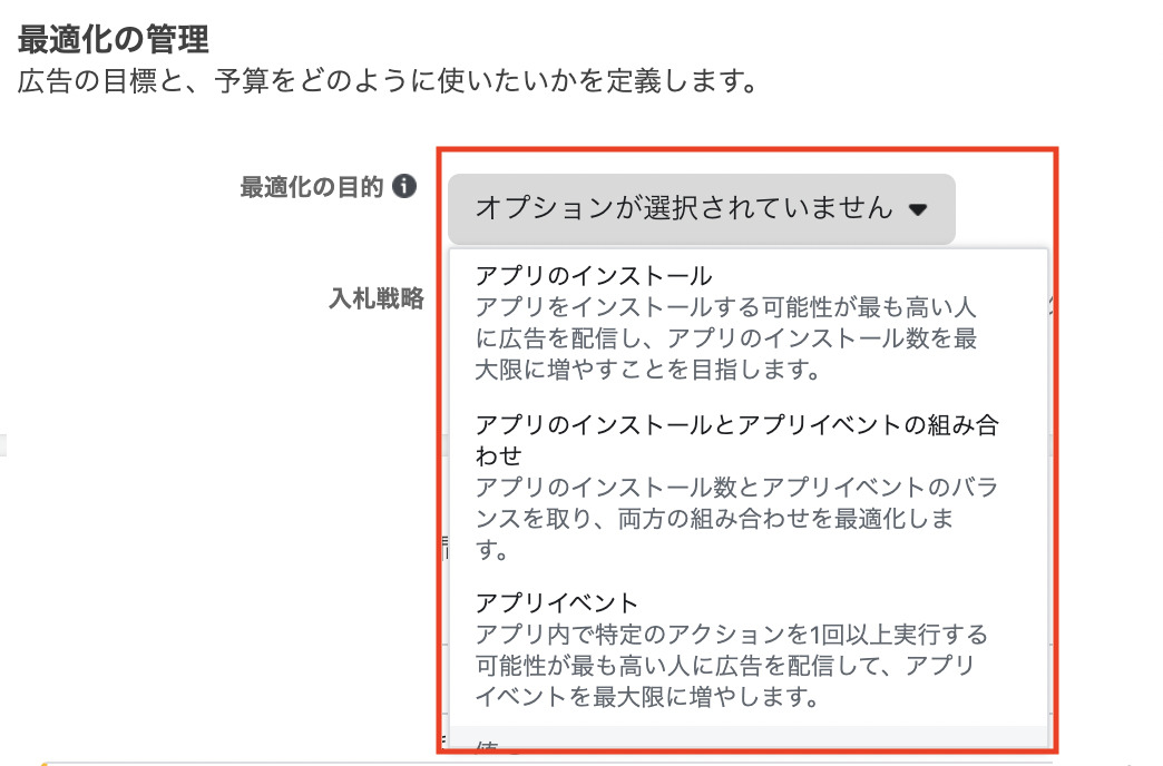 インストール数を伸ばしたい方は「アプリのインストール」など広告の目的によって選択しましょう。