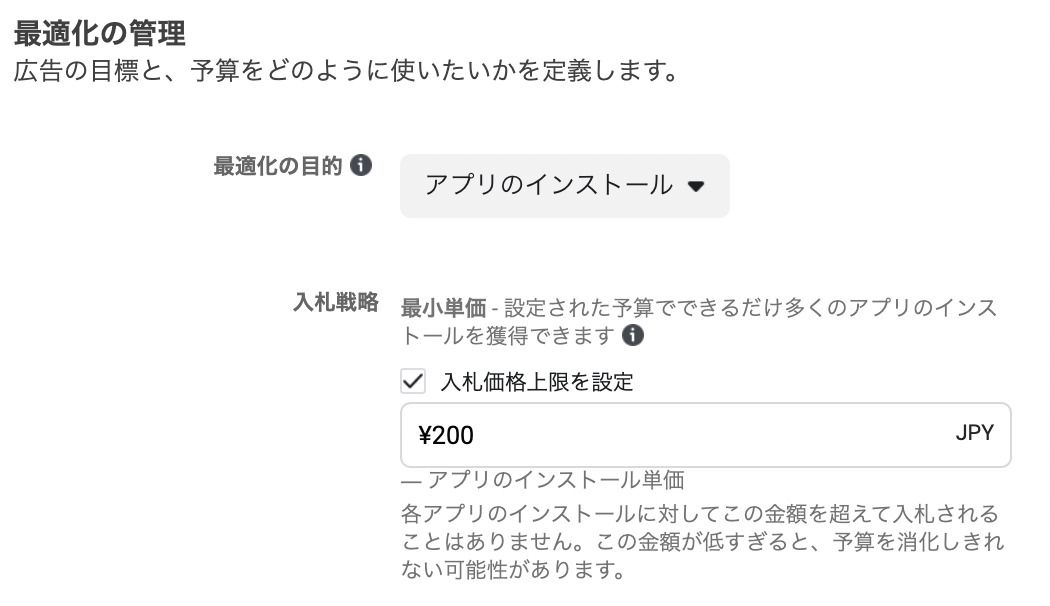 入札戦略は入札価格上限を設定しておくと予算内でインストール数を獲得できるため設定しておくとよいでしょう。