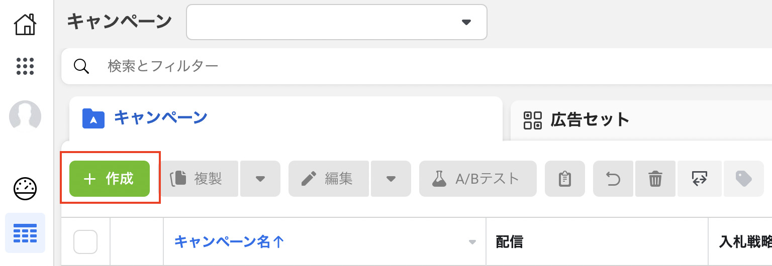広告マネージャーを開き「作成」をクリックします。