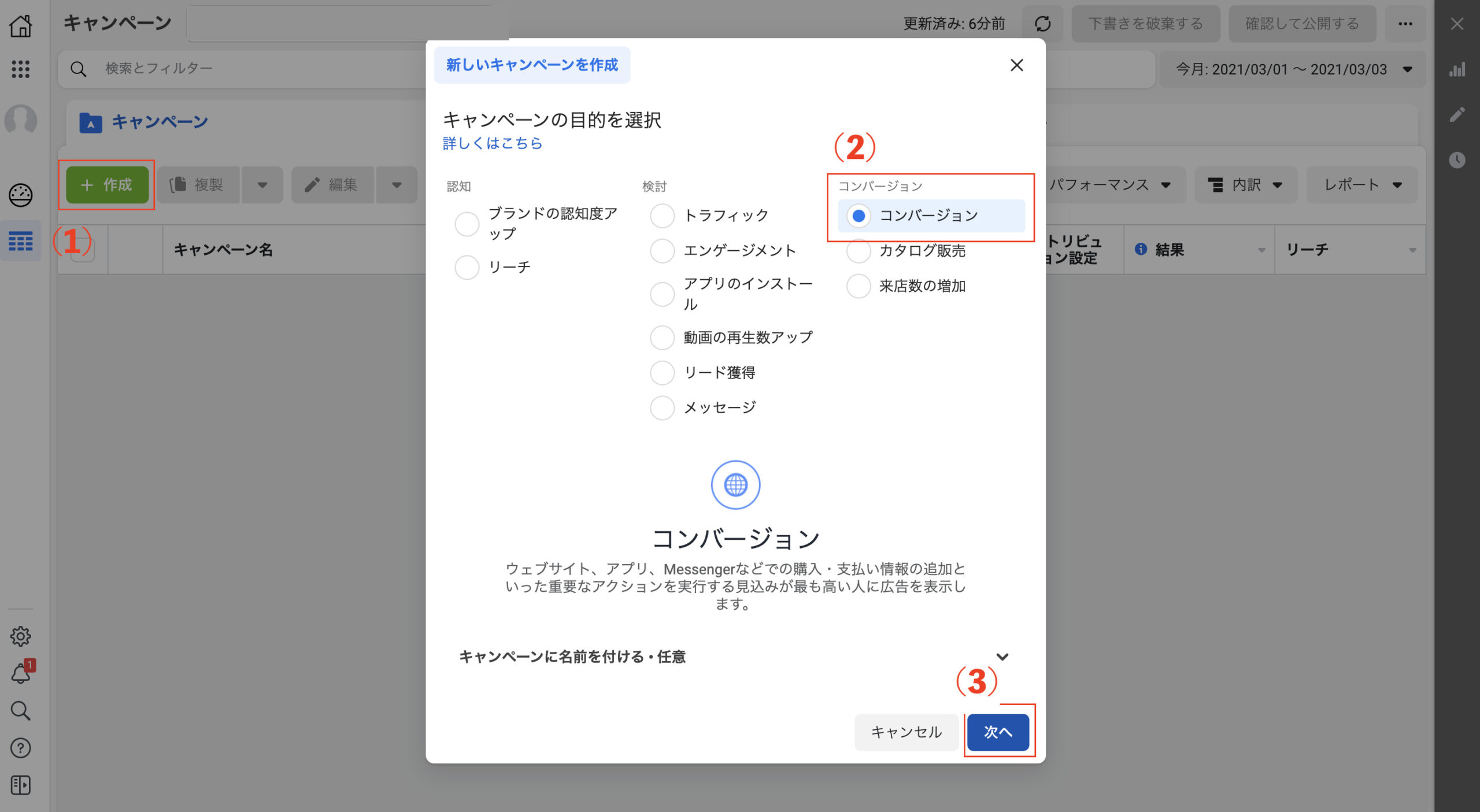 (2)目的をコンバージョン、アプリのインストール、トラフィックのいずれかで設定します。