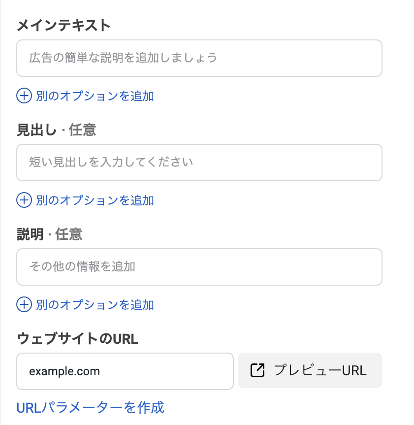 メインテキスト、見出し、説明などを入力していきます。別のオプションを追加、をクリックすることで枠を増やすことができます。