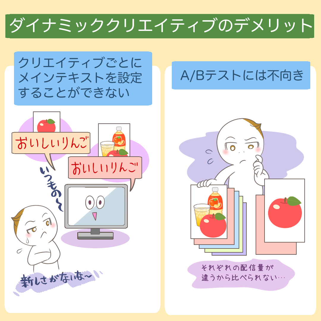 ダイナミッククリエイティブはクリエイティブごとにメインテキストを設定することができません。今まで入稿していたものと全く異なるクリエイティブを入稿したい場合、メインテキストが凡庸的になってしまいます。それにより、広告効果の最大化が図れない可能性が出てきてしまいます。
