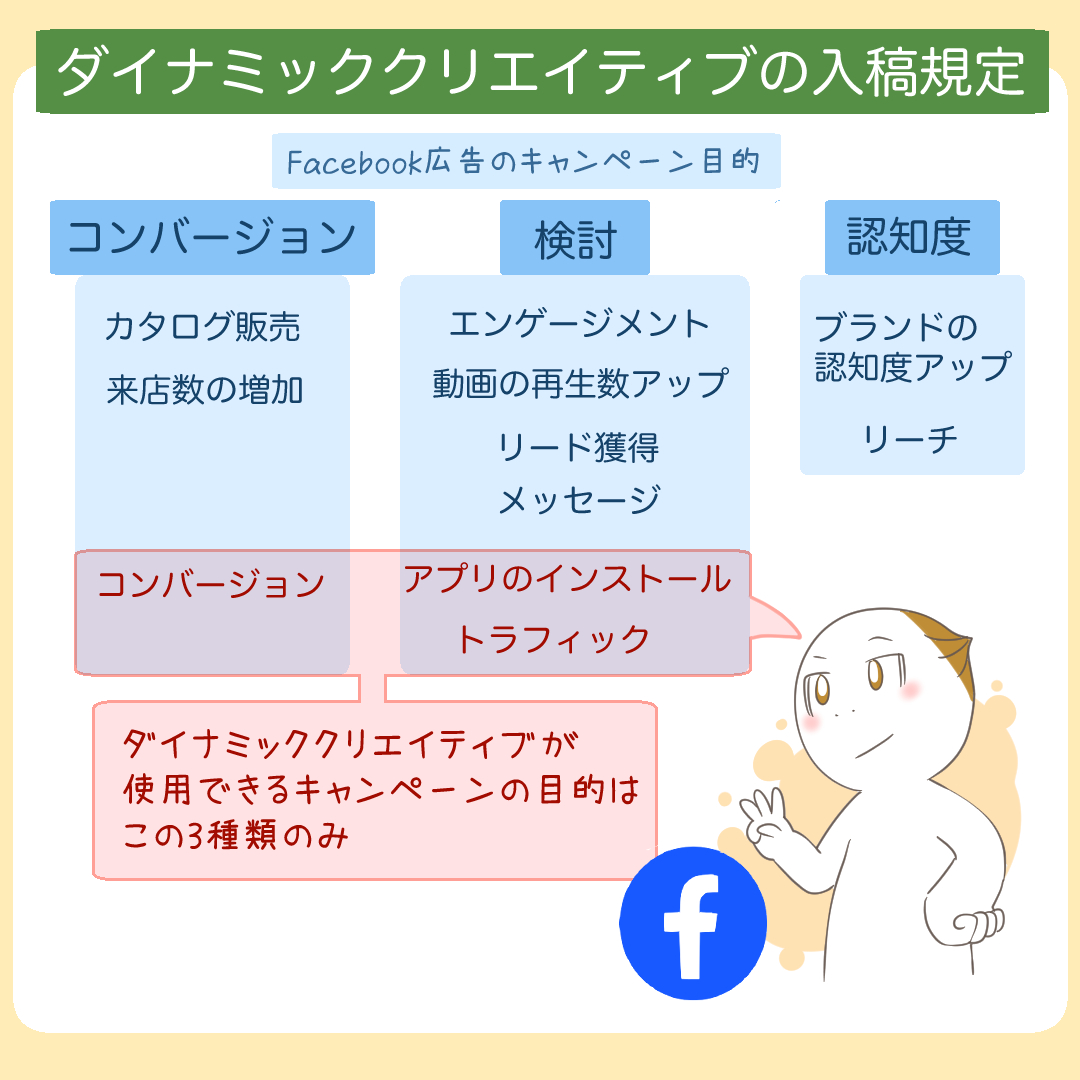 Facebook広告の数あるキャンペーン目的の中でダイナミッククリエイティブが使用できるキャンペーンの目的は下記の3種になります。