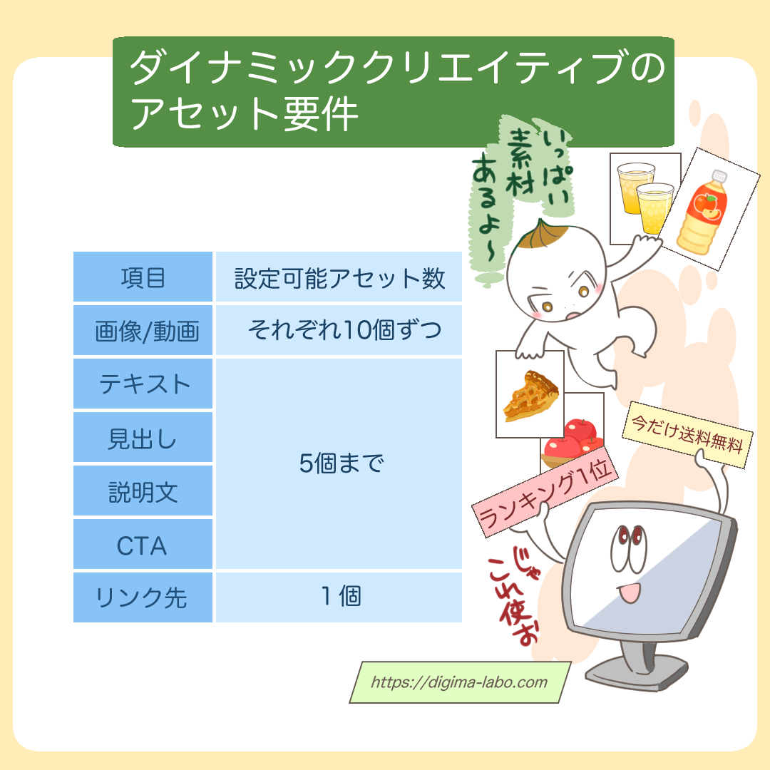 ダイナミッククリエイティブで設定できるアセットは以下の通りです。