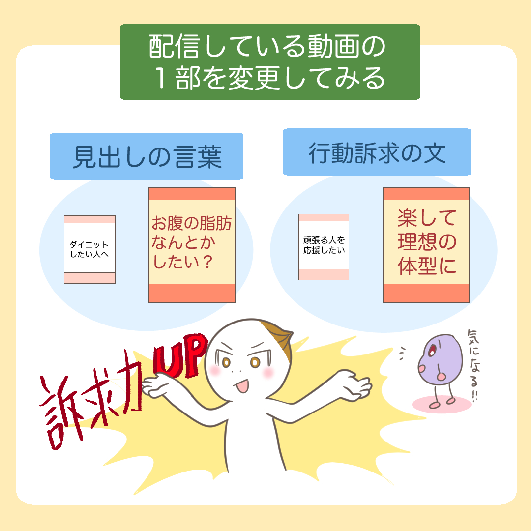 動画で配信を行なっている場合、最初の見出しの言葉、最後の行動訴求の文を変えてみるだけで成果が改善される場合が多く見受けられます。