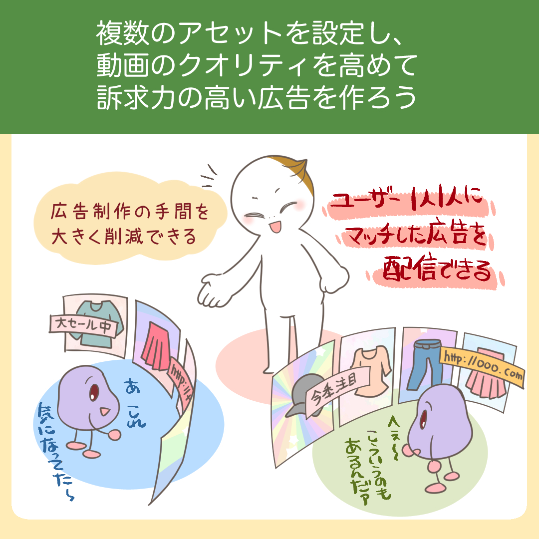ユーザーに対してどのような訴求が効果的なのかをダイナミッククリエイティブでは、複数のアセットを設定するだけで自動的に配信を最適化してくれるため、簡単に有効な訴求を模索することが出来ます。