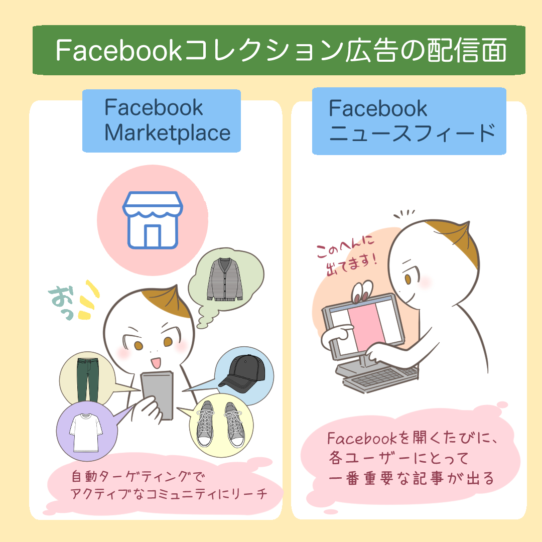 Facebookでは多くの配信面がありますが。下記の「Facebookニュースフィド」と「Facebook Marketplace」が配信面になります。
