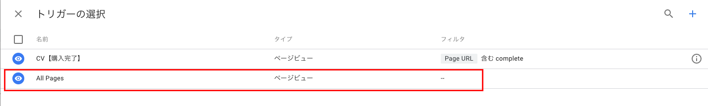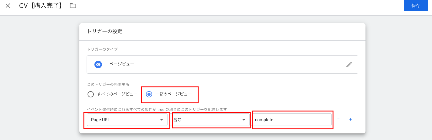 タグページに戻り、トリガー部分をクリックして、先ほど作成したトリガー「CV【購入完了】」をクリックし、保存すれば紐付け完了です。