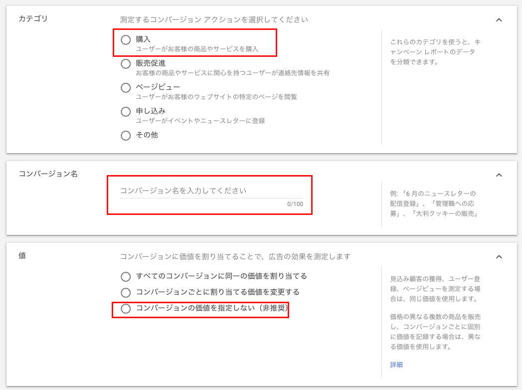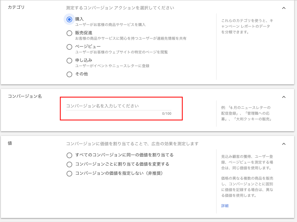 カテゴリで購入を選択し、コンバージョン名を入力します。