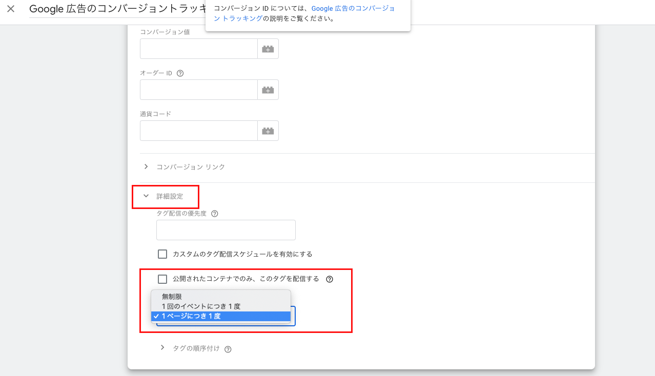 コンバージョンIDとコンバージョンラベルを設定する際に「詳細設定」からタグ呼び出しオプションを「1ページにつき1回」に設定してください
