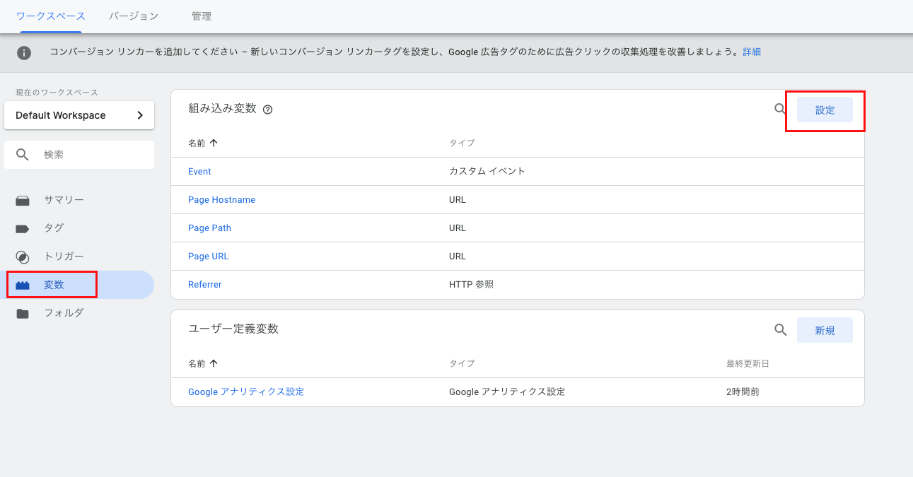 変数ページから、設定をクリックします。