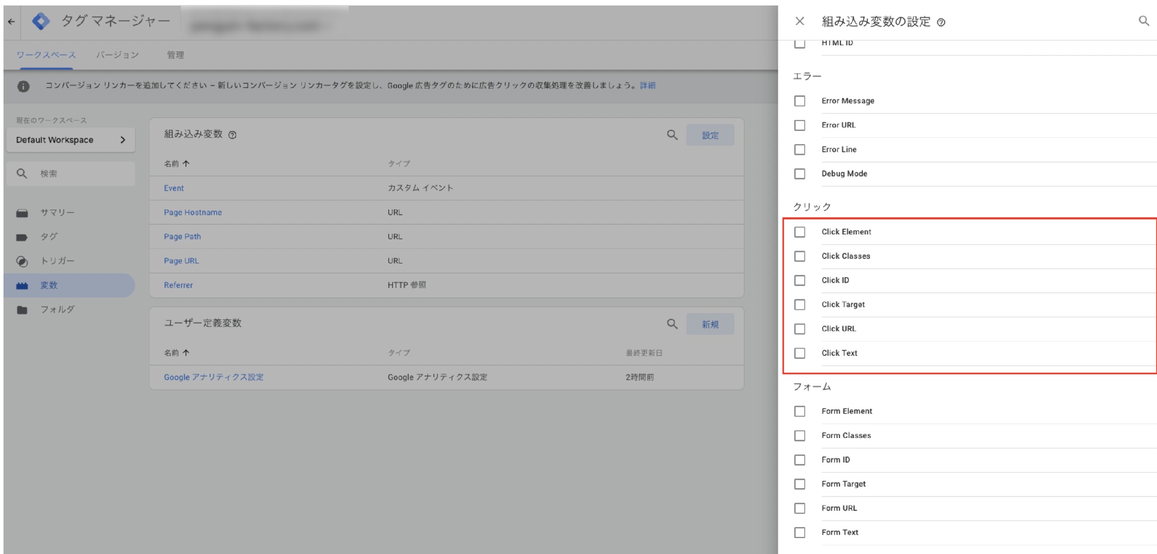 組み込み変数の「クリック」を全て追加します。項目をクリックすれば追加されるので、保存などを押す必要はありません。
