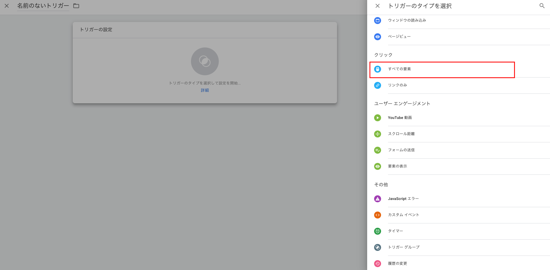 トリガーのタイプの設定で、「クリック」「すべての要素」をクリックします。