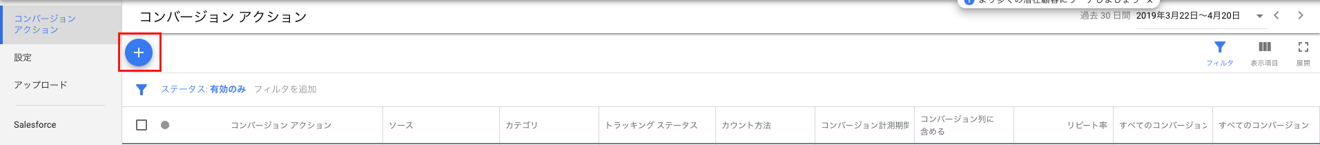 左上の+ボタンをクリックし、コンバージョンアクションを新規で作成します。