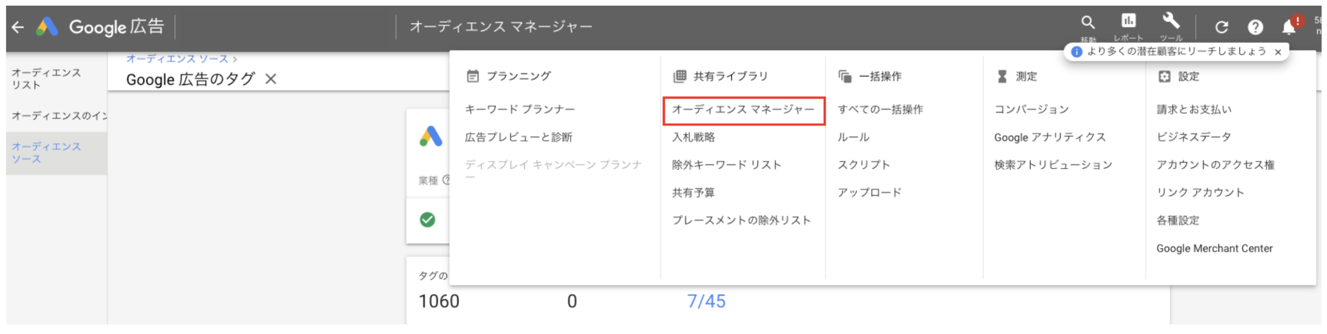 Google広告の管理画面に移動し、ツール→オーディエンスマネージャーの順にクリックします。