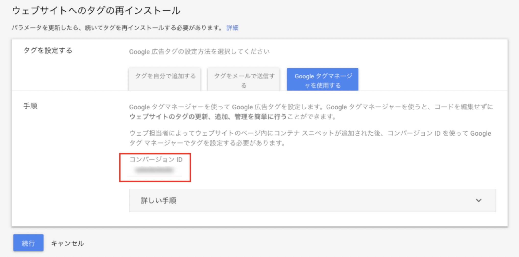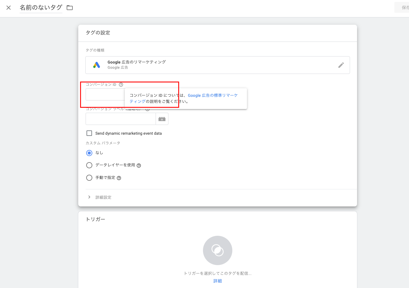 コピーした値を、Googleタグマネージャーの「コンバージョンID」にペーストしてください。