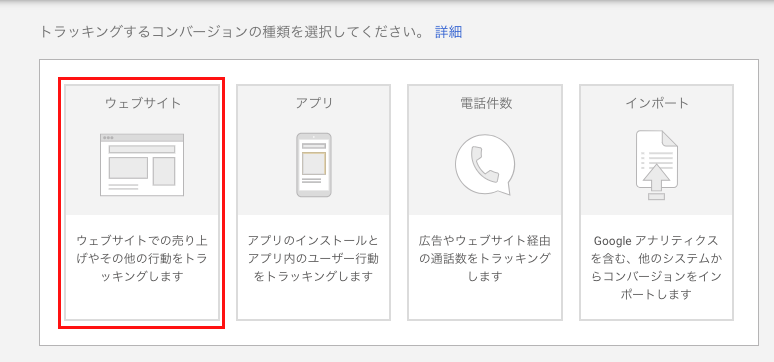 サービスのトラッキングするコンバージョンの種類を選択します。ECサイトの場合は「ウェブサイト」を選択します。
