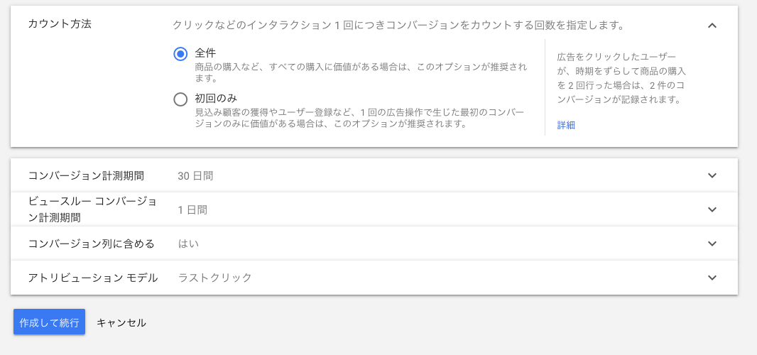 次にコンバージョンの価値は指定しないに設定します。カウント方法はそのまま設定していきます。
