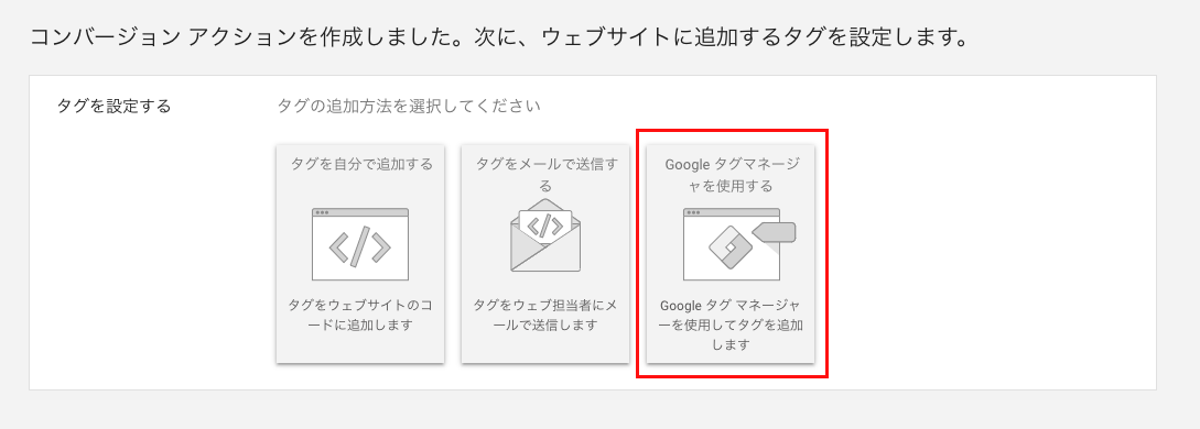 タグの設定方法で「Googleタグマネージャーを使用する」をクリックします。