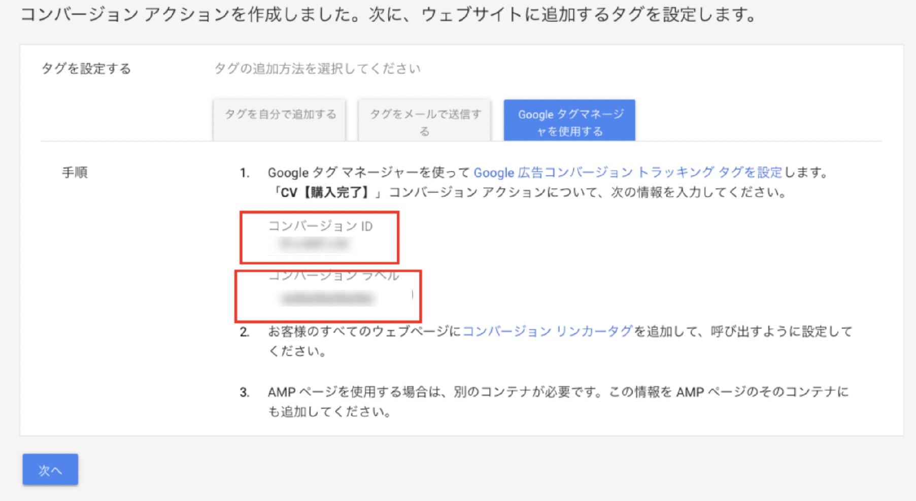 コピーした値を、Googleタグマネージャーの「コンバージョンID」と「コンバージョンラベル」にペーストします。