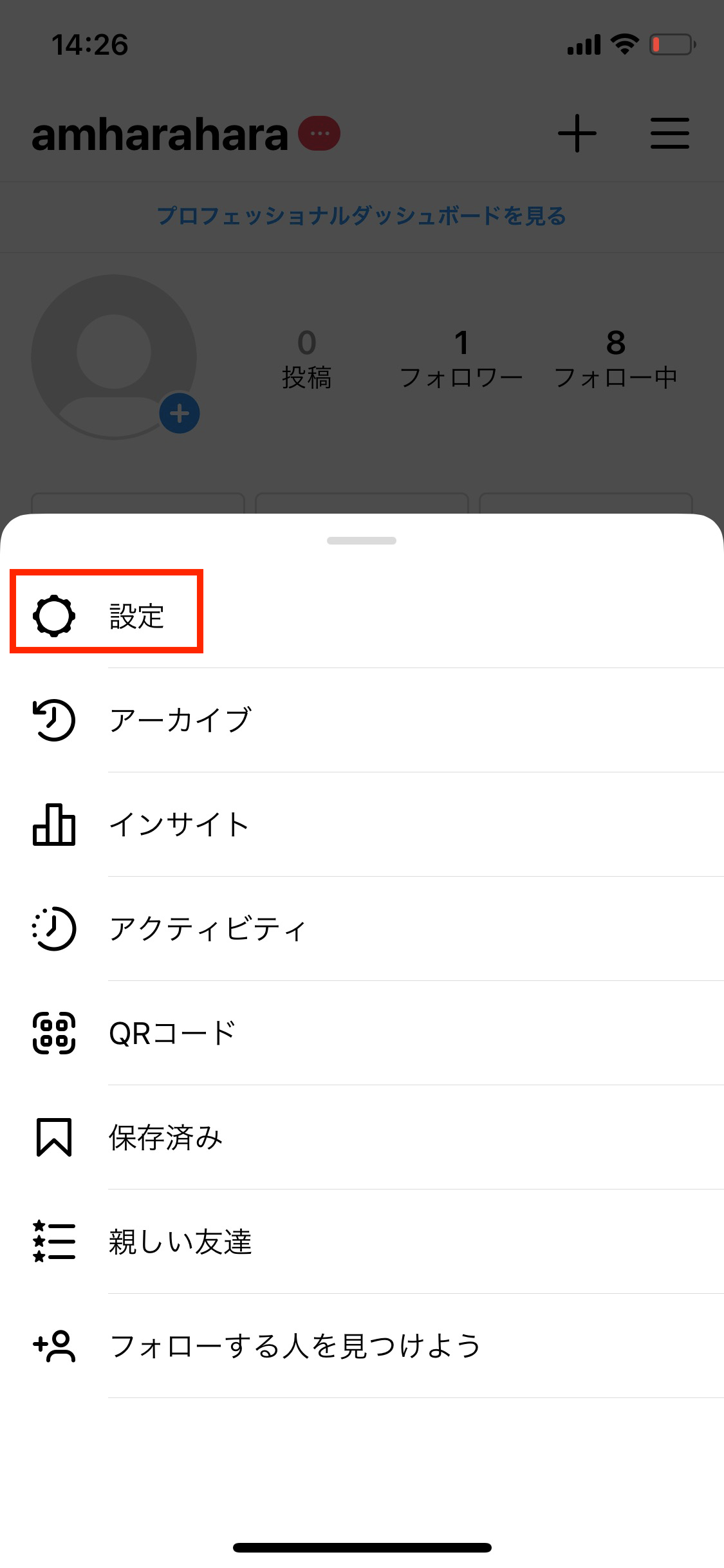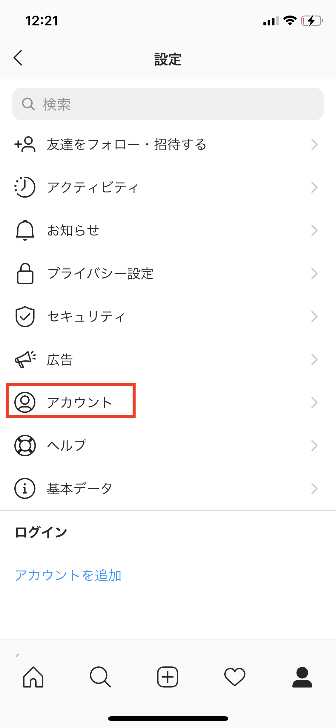 ①プロフィールページのメニューからプロフィール画面の右上の[設定]をタップし[アカウント]を選択する