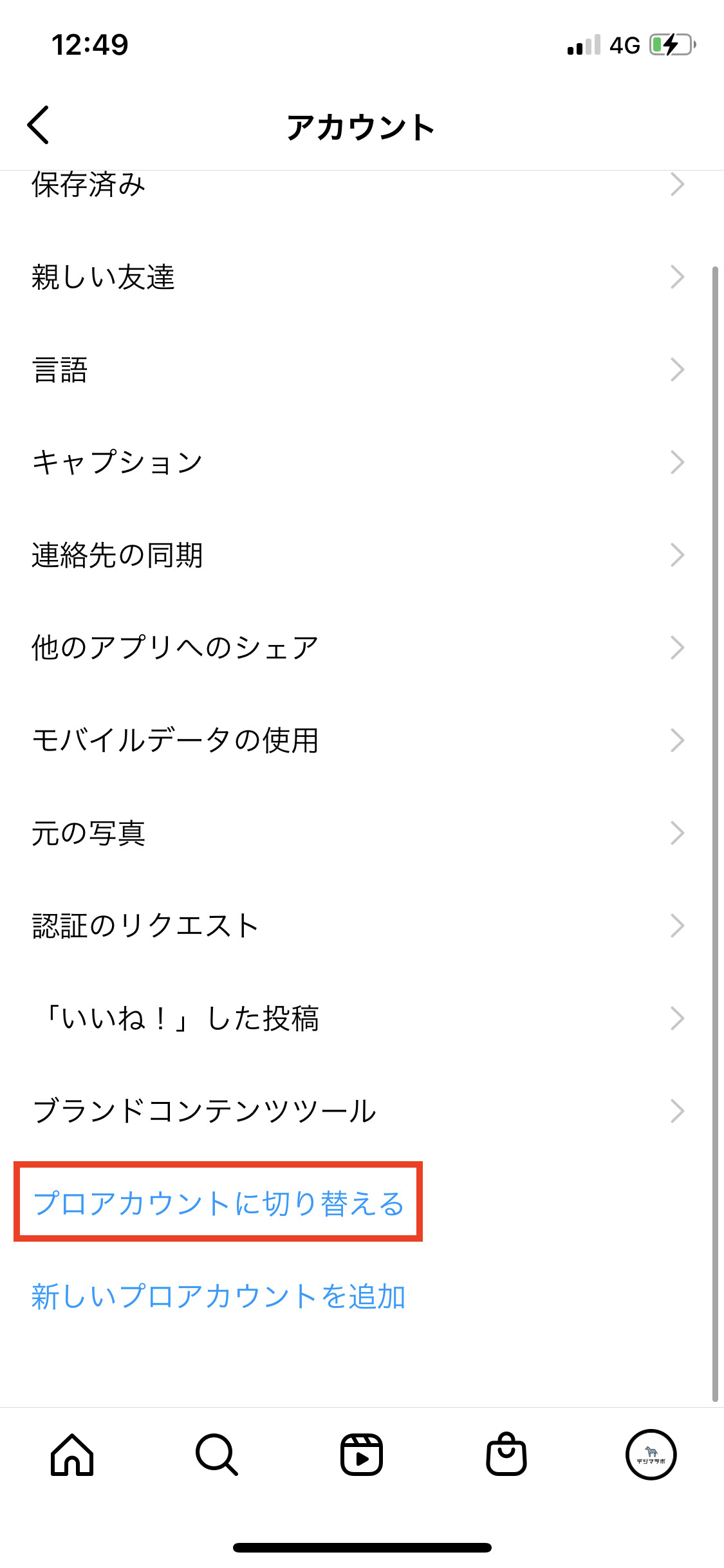 ②スクロールし下にある [プロアカウントに切り替える]あるいは[ビジネスアカウントに切り替える]をタップしクリエイターとビジネスを選択する画面に進みます。