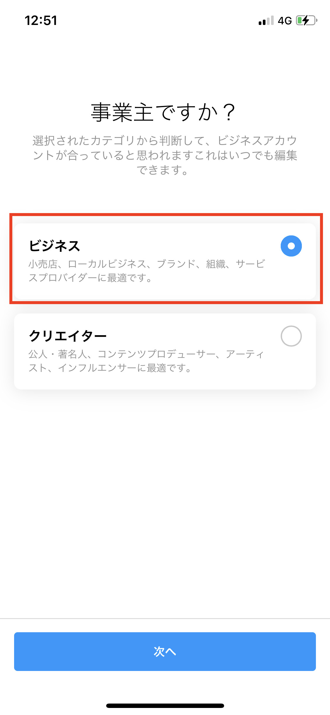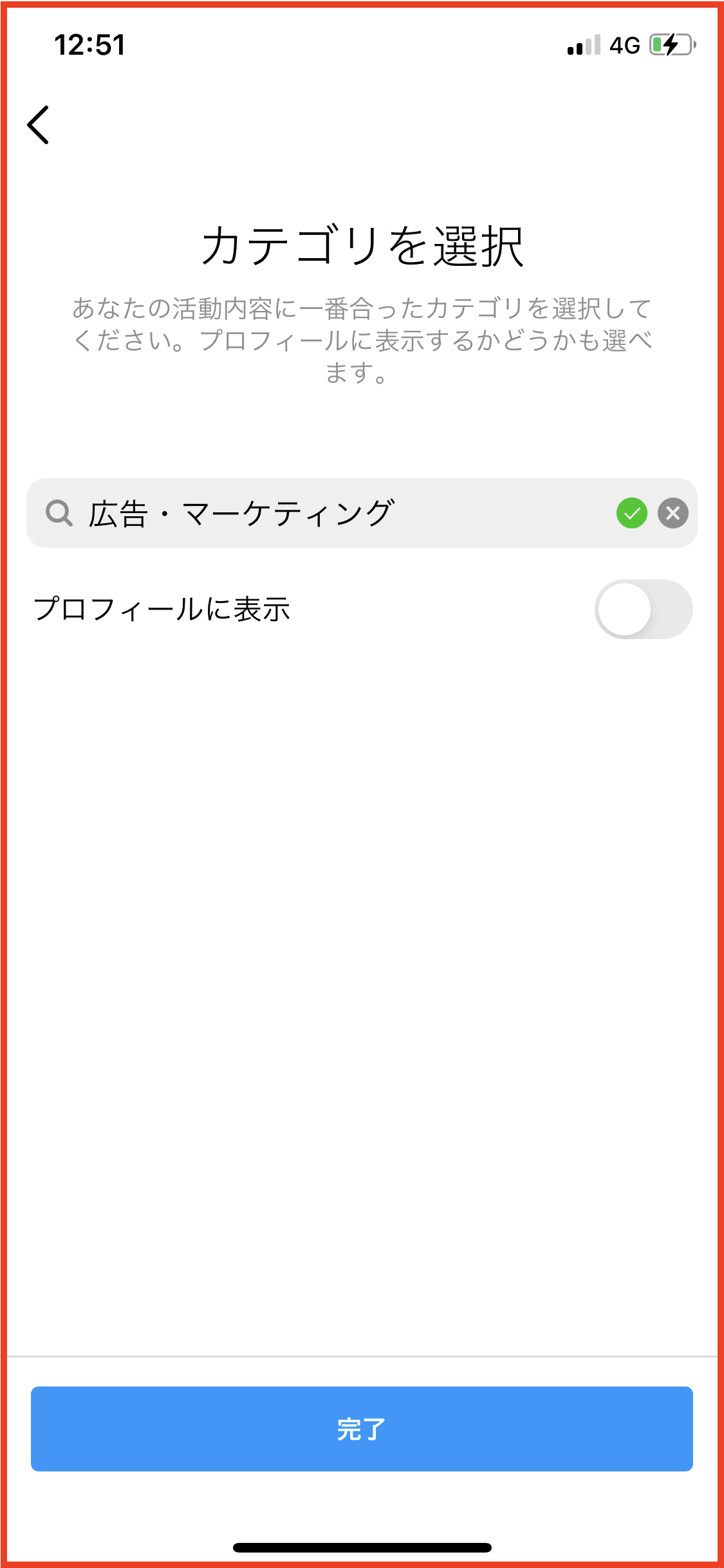 最後にビジネスカテゴリを選択し、プロフィール画に表示可能な情報を登録し[完了]をタップすればビジネスアカウントに切り替えは完了です。