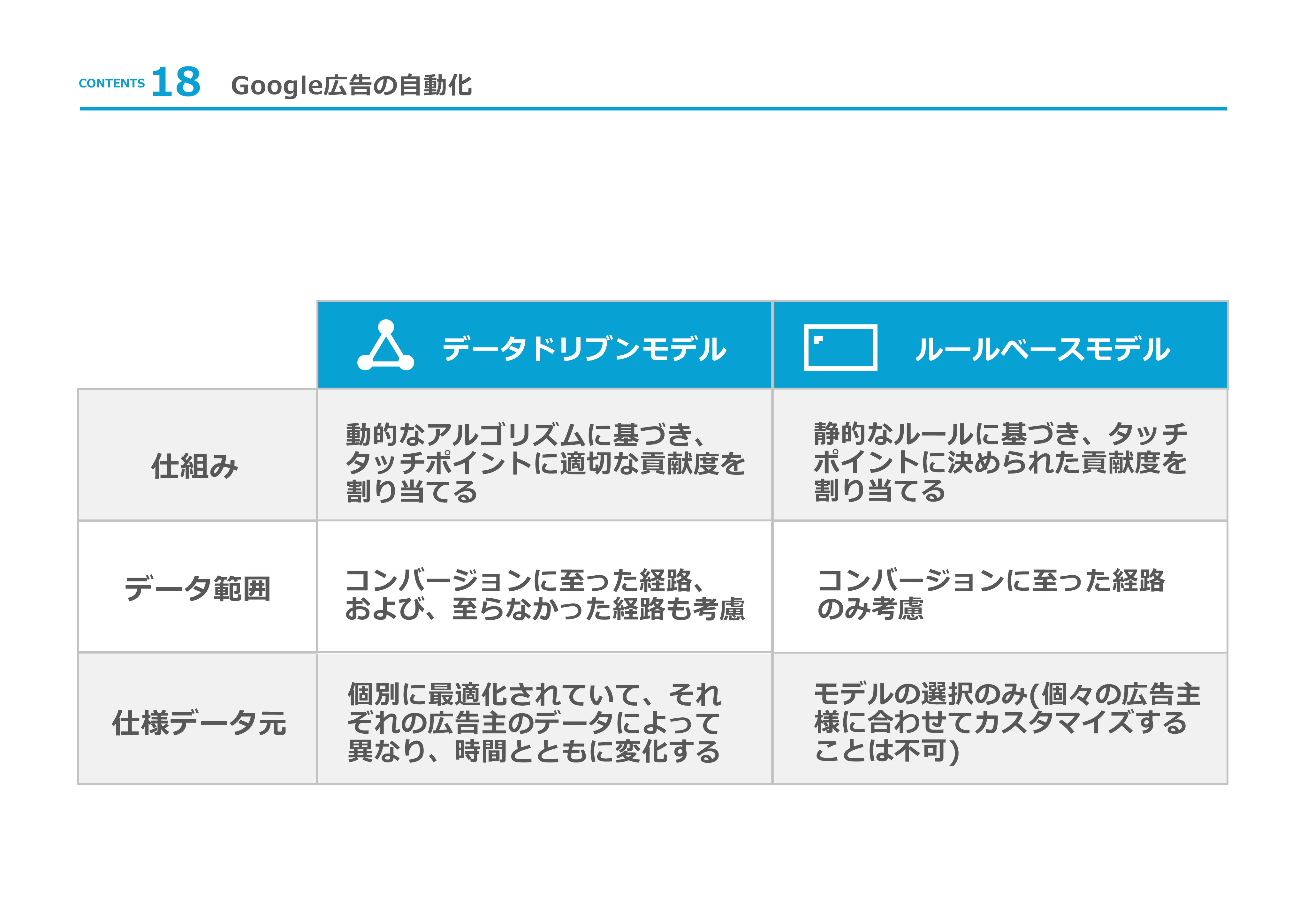 DDA では、アカウント データと Google の機械学習機能を活用して、最も影響力の大きいタッチポイントを判断します。そして、ユーザーの購入経路における各キーワードの実際の貢献度に応じて価値を割り当てます。さらに、ある程度の期間にわたって学習して調整されるため、常に精度を高めていきます。引用元:ユーザーの変化に対応するためのアトリビューション分析 – Google 広告主コミュニティ