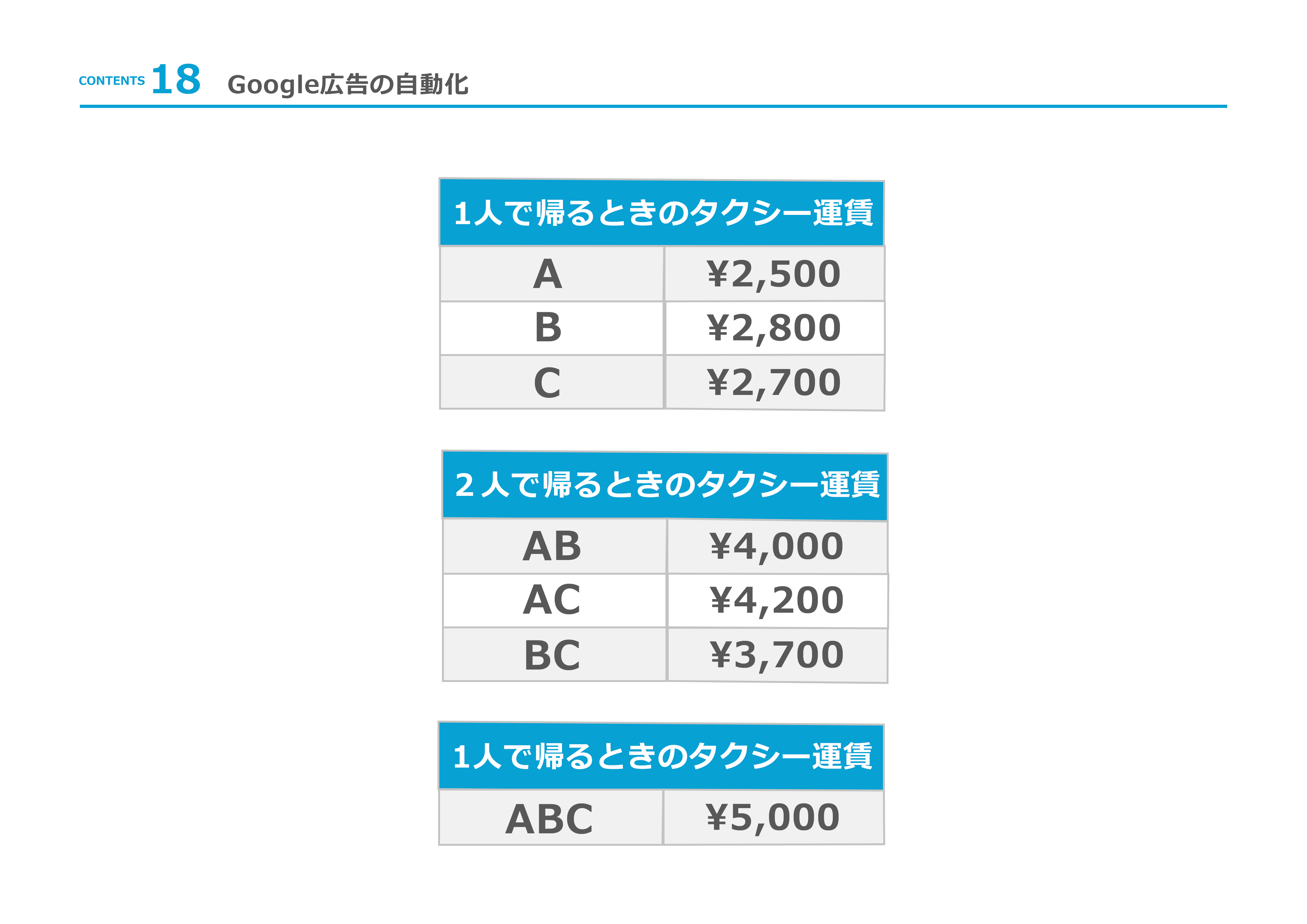 ①‘AさんがCさんを誘ってタクシーに乗ることで、タクシー運賃は4,200円になるので、Cさんは1,000円貢献(2,500円+2,700円-4,200円=1,000円)したことに。