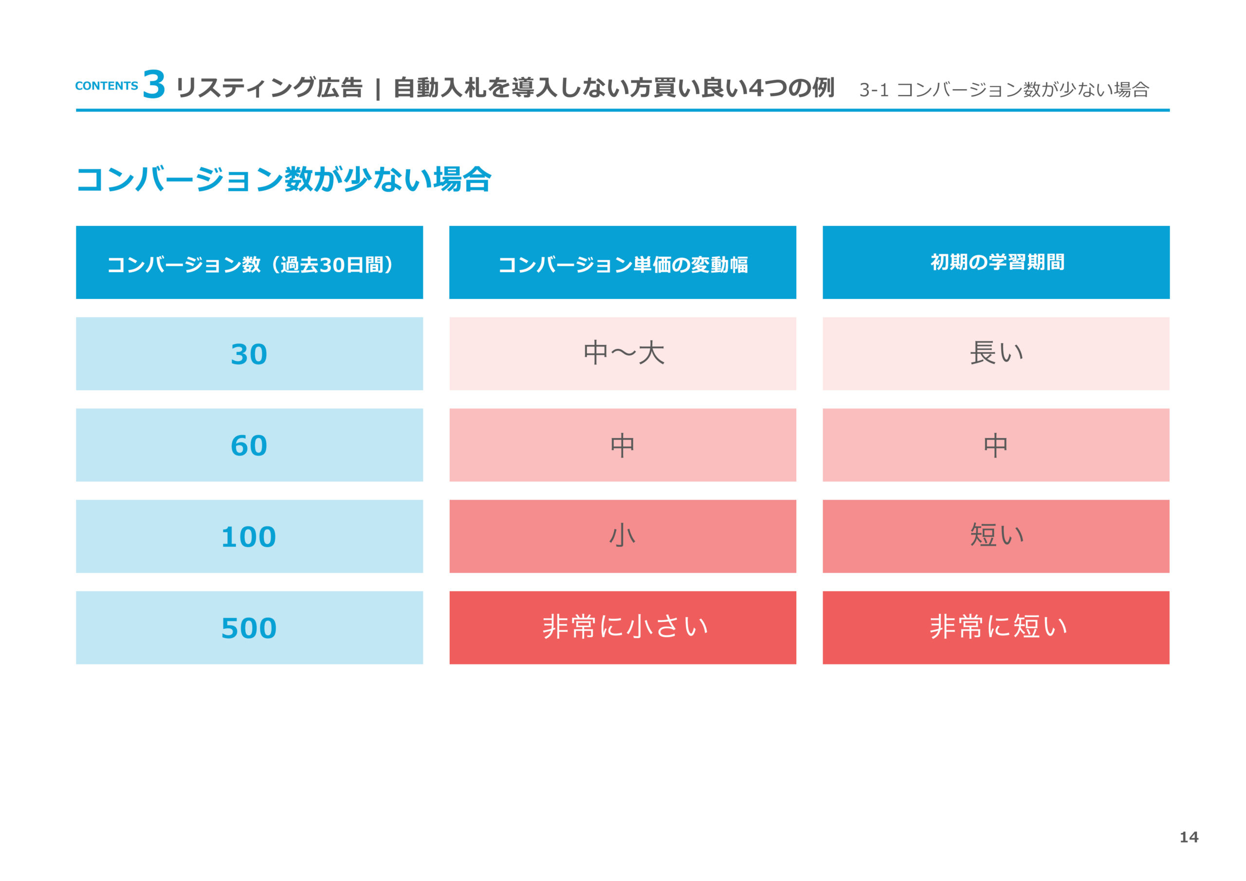 具体的には、目標コンバージョン単価の場合コンバージョンが過去30日に30回以上、目標広告費用対効果の場合は50回以上発生していることが推奨されています。