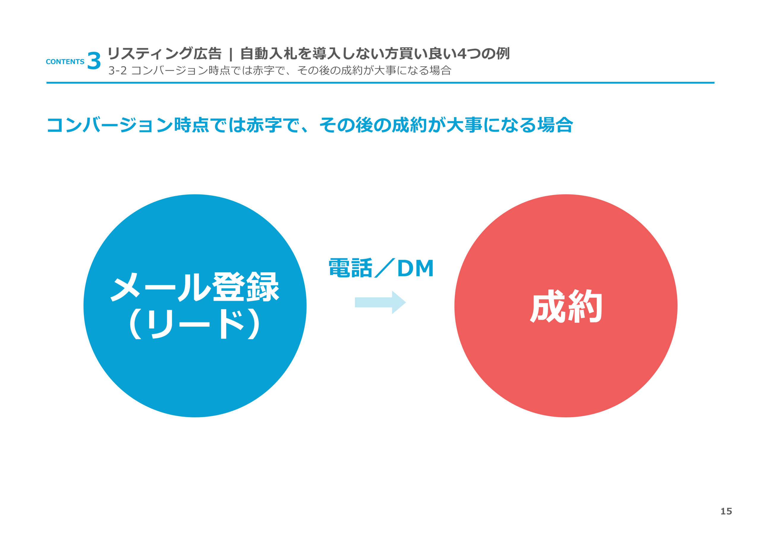 これらの指標を管理画面にリアルタイムに反映させることは、現実的には難しいことも多いです。そのため単純に管理画面のコンバージョンの数値をもとに自動入札を導入して成果が上がっても、実際のビジネスの目的に対する費用対効果が悪化する可能性もあります。