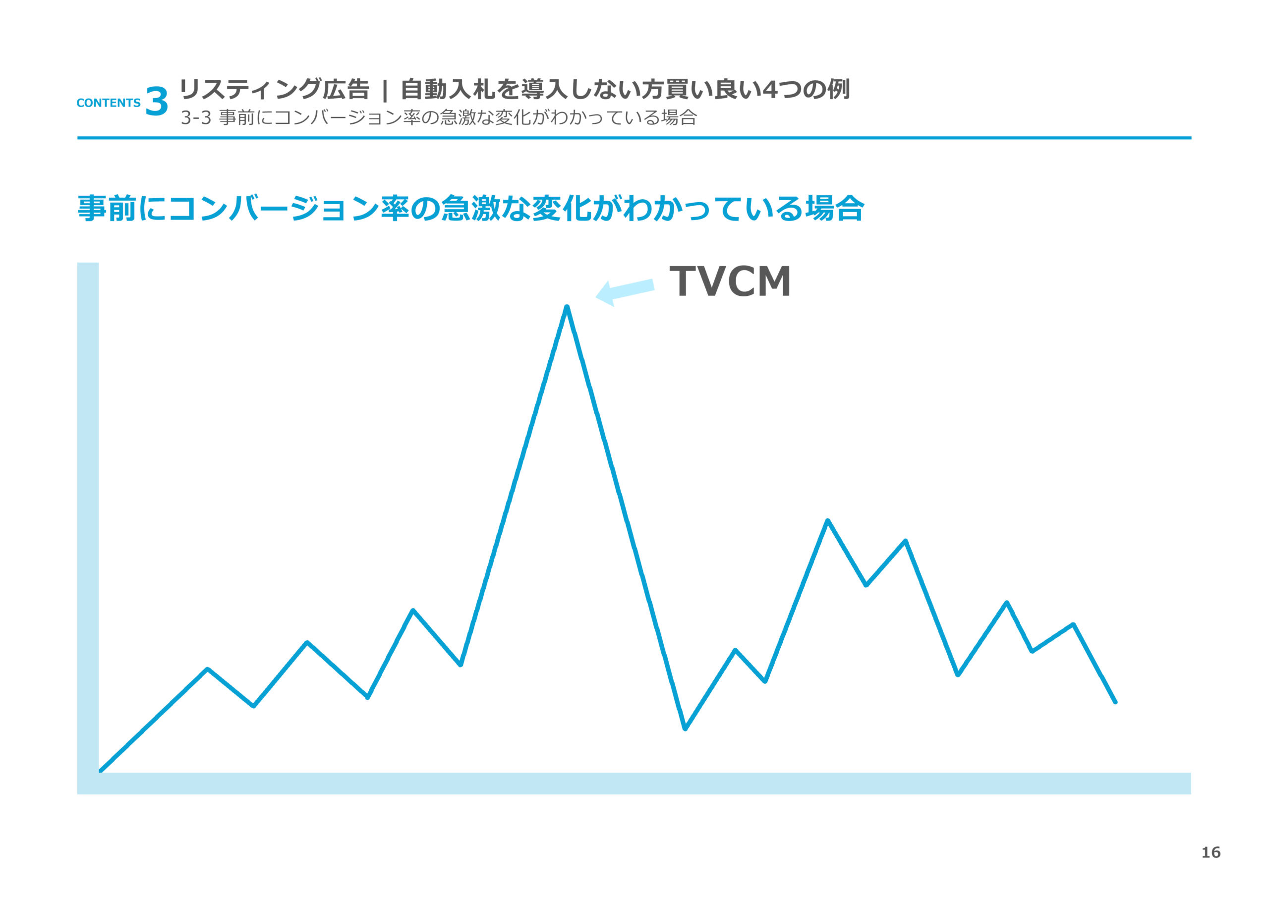 このようなケースではいったん拡張クリック単価(eCPC)に切り替えて手動で調整を掛けると良いでしょう。データが溜まった段階で再度自動入札に切り替えれば、変化に伴う機会損失を最小限に抑えることができます。