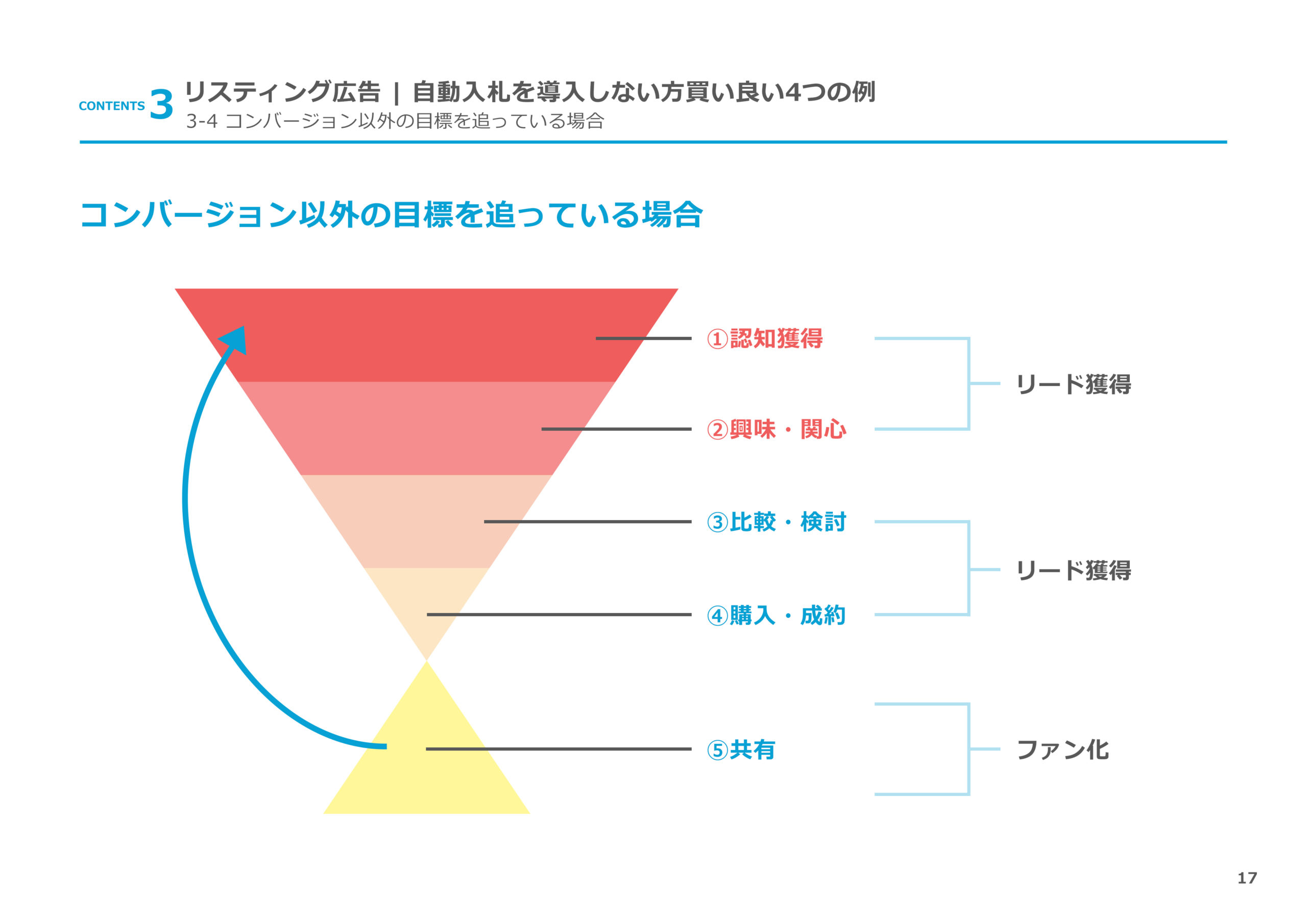 このような場合は、コンバージョンを目標としていないためスマート自動入札は導入しない方が良いでしょう。上位掲載であれば「検索ページの目標掲載位置」、インプレッションの最大化であれば「視認範囲のインプレッション単価制(vCPM)」など他の入札戦略を利用することをおすすめします。